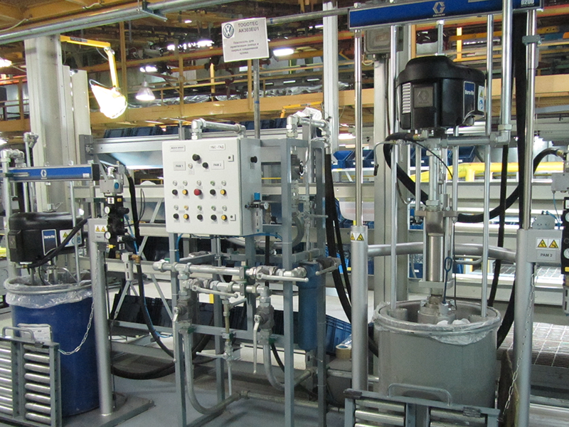 Для нанесения редких цветов на автомобильных заводах часто используется мобильная мини система подачи ЛКМ, которую можно переместить в любое место непосредственной близости от камеры окраски.