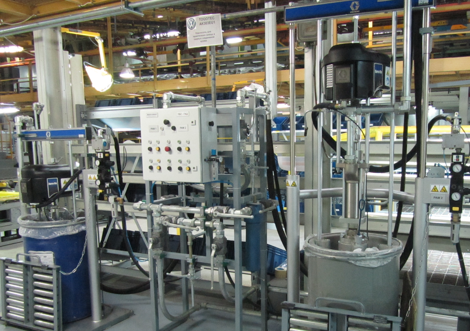 Система подачи и нанесения мастики сварные швы автомобиля представляет собой типовую установку подачи мастики из стандартной бочки объемом 200л. При этом существует 2 варианта компоновки оборудования. Первый вариант: система состоит из двух одинаковых установок, переключение между которыми осуществляется в автоматическом режиме. Контроль работы оборудования осуществляется при помощи пневматического шкафа управления. Этот вариант является приоритетным, т.к. позволяет осуществлять беспрерывную подачу мастики на линию нанесения. Второй вариант: система состоит из одной установки. Контроль работы оборудования, осуществляется также при помощи пневматического блока управления. В этом варианте происходит остановка подачи материала в связи со сменой бочки. Для очистки материала от загрязнений используется система фильтрации, состоящая из двух фильтров с возможностью легкой замены одного из них, пока другой находится в работе. Подача материала до поста нанесения осуществляется по трубопроводу из углеродистой стали. Мастика наносится на сварные швы автомобиля при помощи пистолетов безвоздушного распыления. В этом случае используются насадки на пистолет различных форм и размеров.